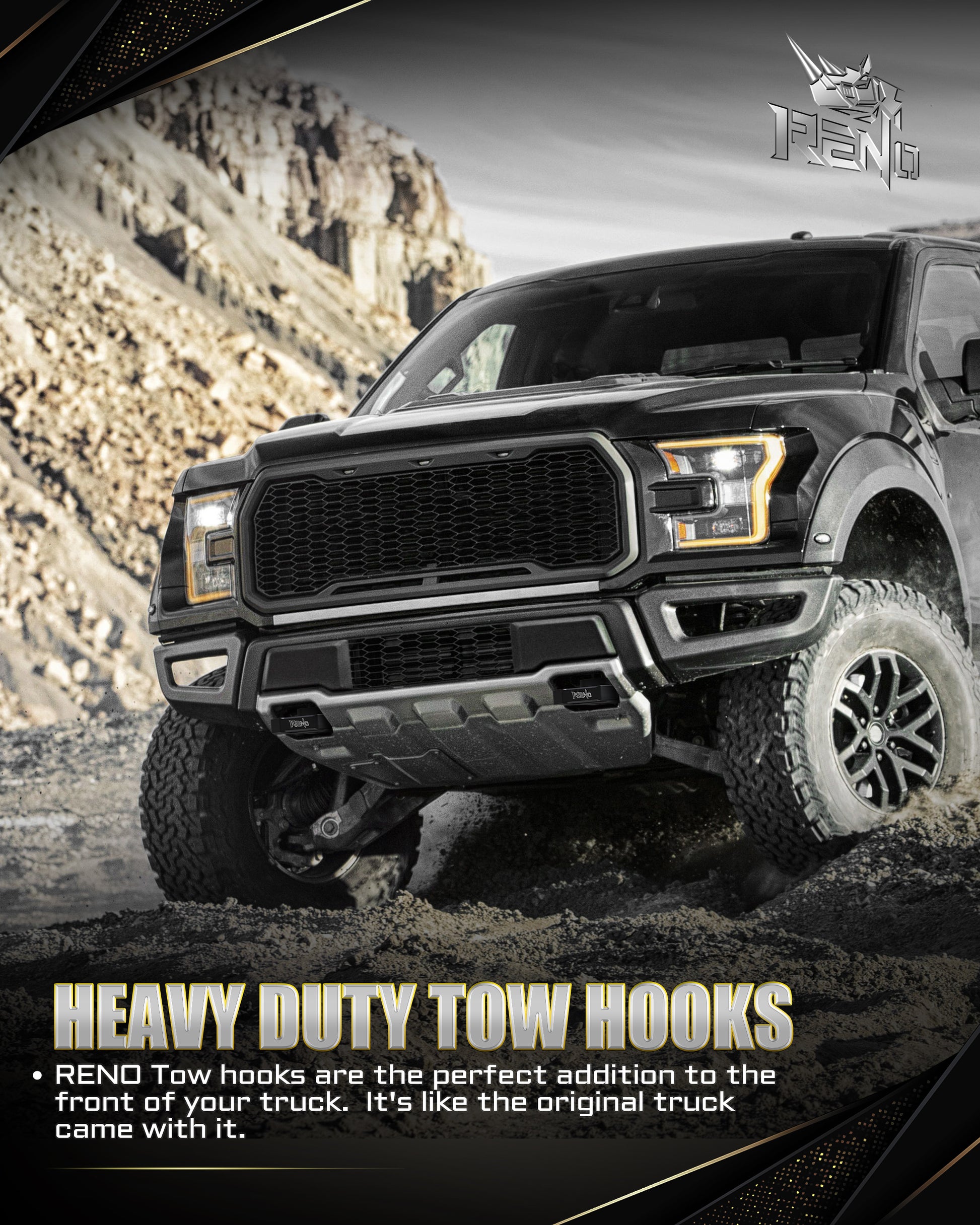 - Upgrade your F150 or Raptor truck with the RENO Aluminum Front Tow Hooks. Made from 7075 solid Aluminum, these tow hooks are strong, Easy to do all towing jobs. Frosted black color with a smooth finish adds a stylish touch to your F150 or Raptor truck.