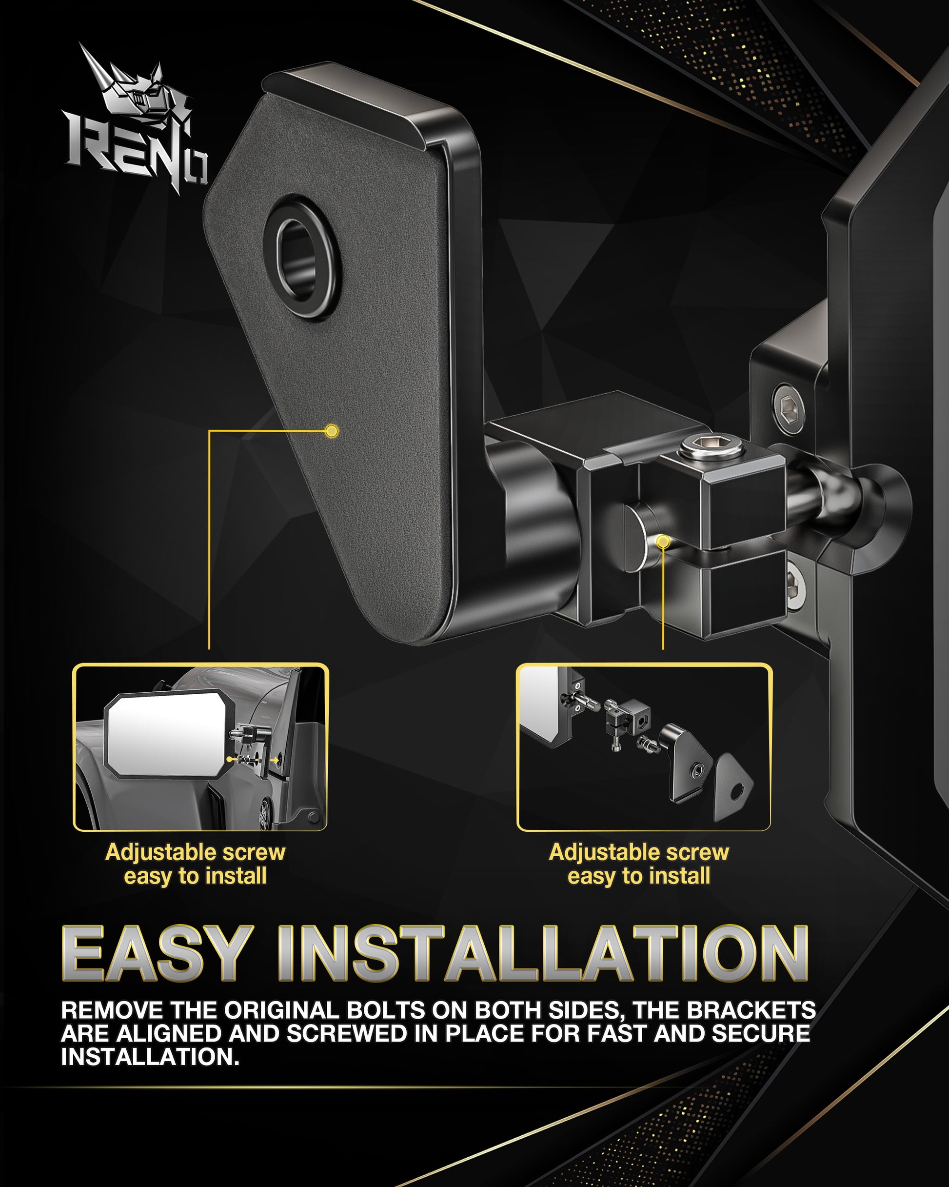 - 【Easy Installation】RENO Wrangler Mirrors door off was specially designed for the 1997-2018 Wrangler JK, JKU & TJ. Adjustable bracket and mirror have been assembled when leaving the factory, no need to assemble it yourself. Compiled with all necessary mounting accessories for quick and easy installation