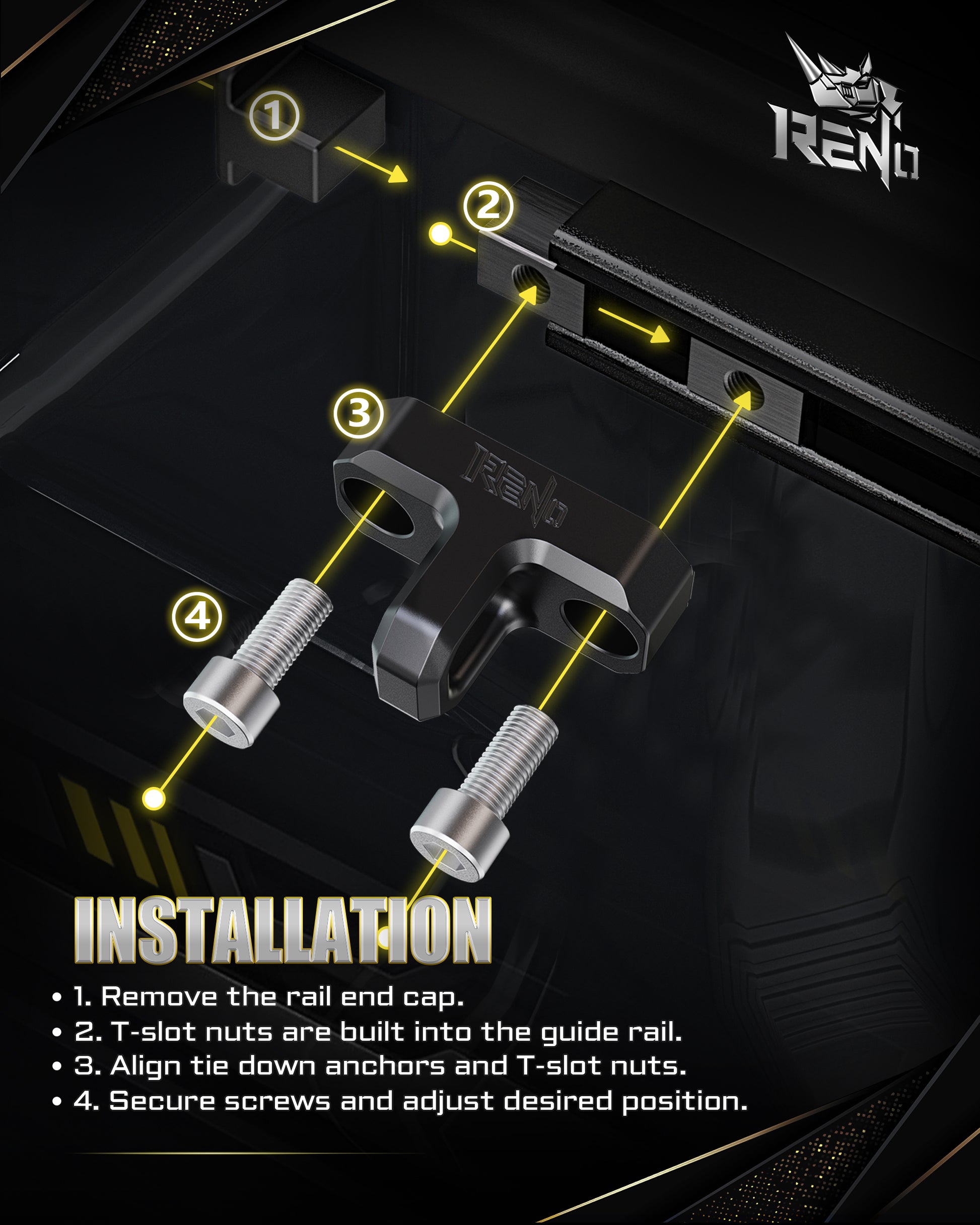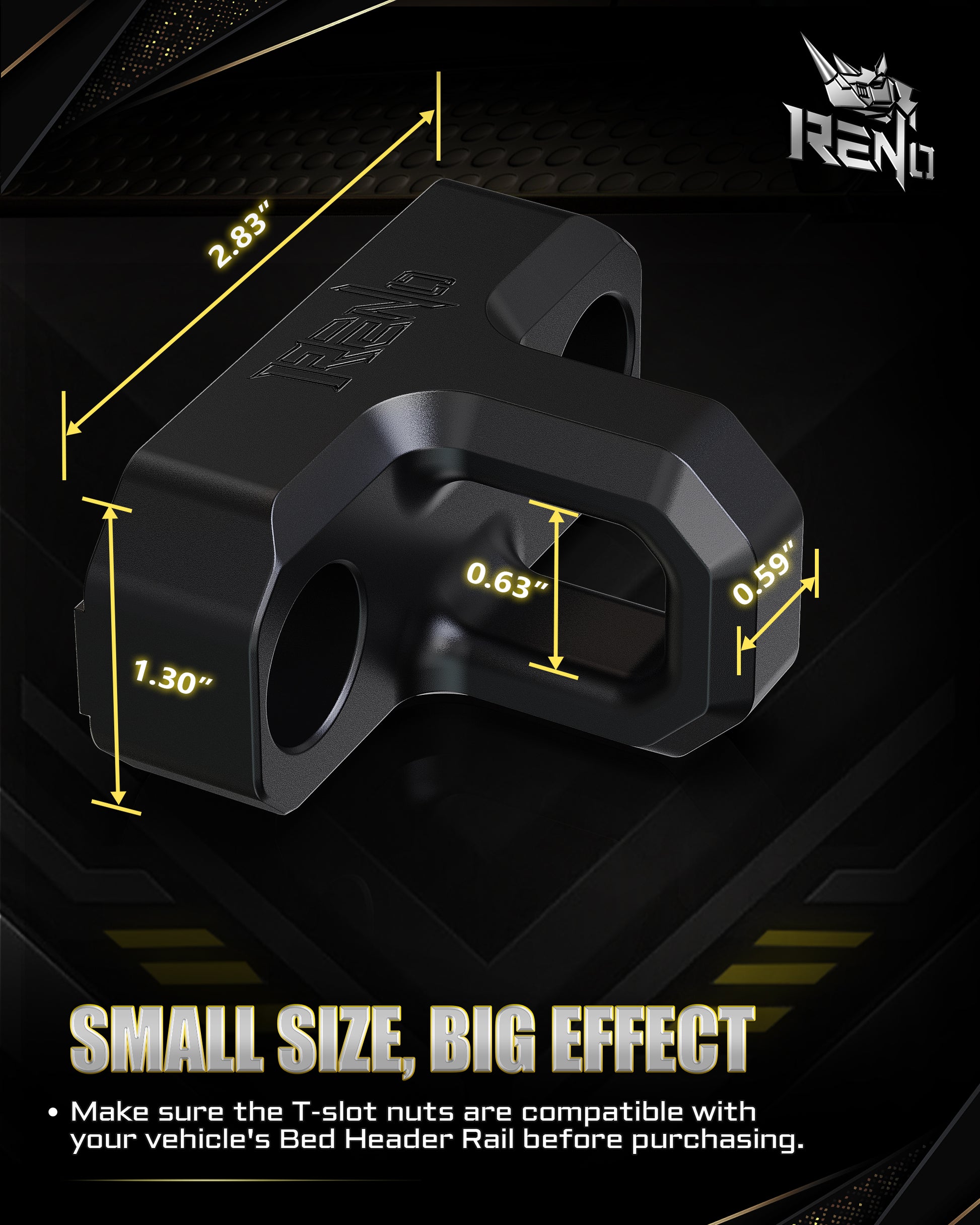 - Easy Installation : RENO Bed Cleat is designed for hassle-free installation. Simply remove the bed rail end caps, insert the T-slot tie down nuts into the rail system, align the bed rail cleat and secure it with locking screws. Within minutes, you can have a sturdy and reliable tie-down anchor in place.