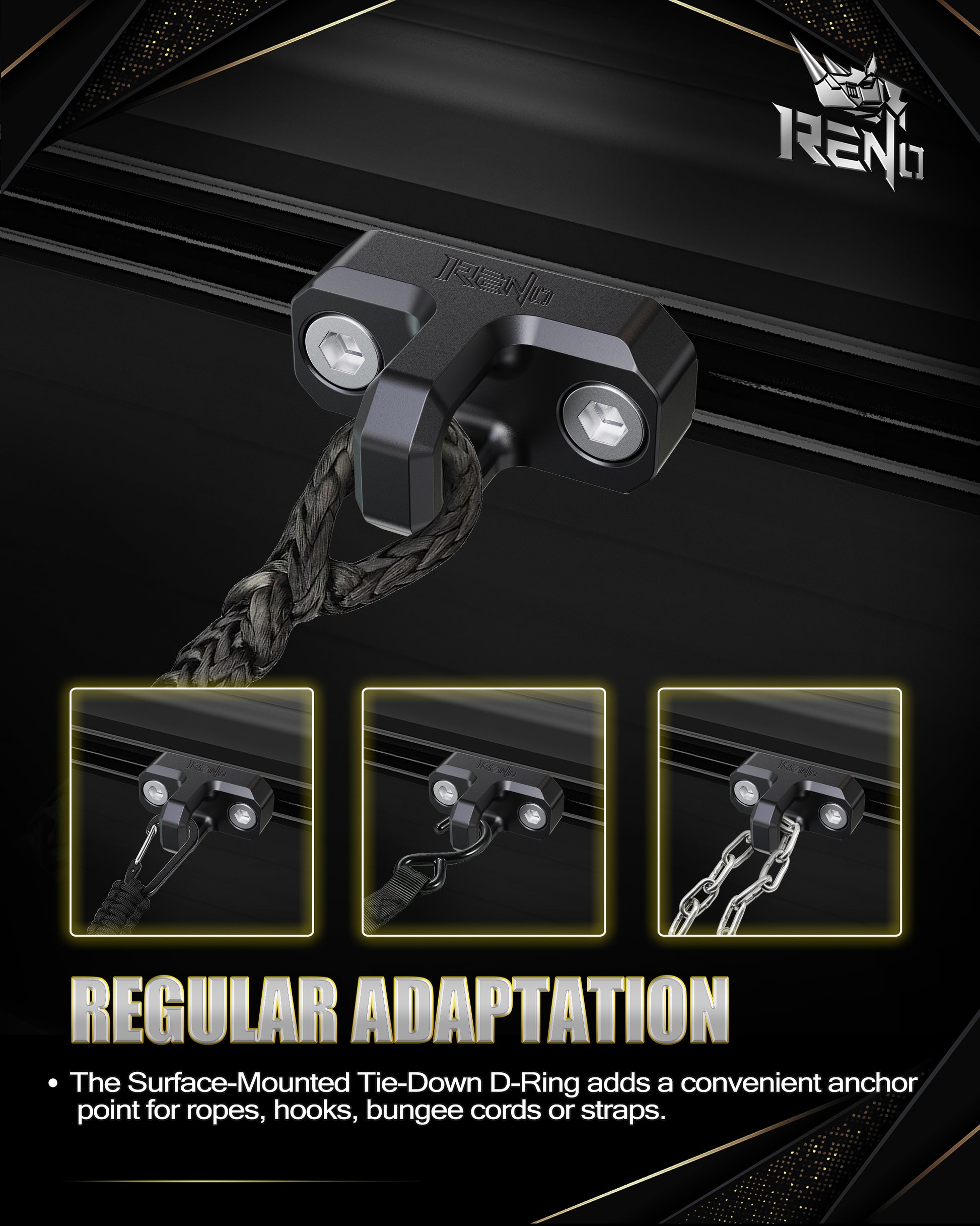 - Additional Mounting Points : RENO Tie Down Anchors offer additional mounting points in your truck bed, allowing you to stabilize various types of loads effectively. Whether you're hauling heavy equipment or fragile items, these bed rail cleats ensure everything stays in place, providing a safe and secure transport experience.