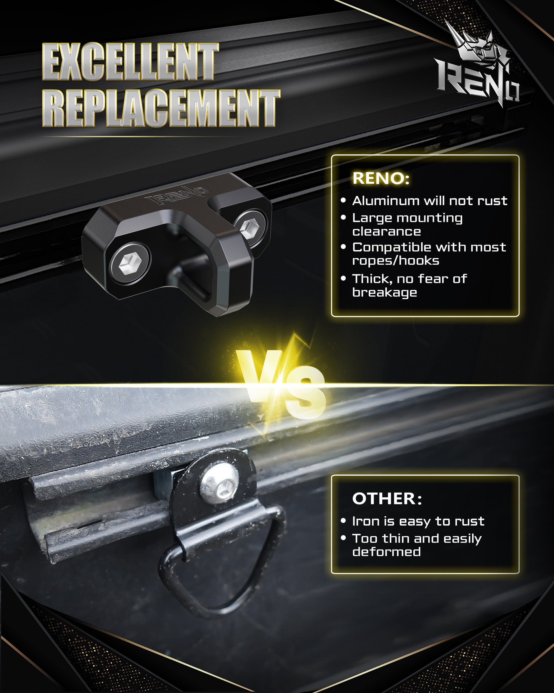 - Reliable Construction : RENO Bed Rail Cleat Crafted from high-quality 7075 aluminum material, ensure you never have to worry about rust damaging your truck bed. You can trust these cleats to hold your cargo securely without chipping, flaking, or compromising performance over time,Capable of withstanding up to 200 pounds of weight.