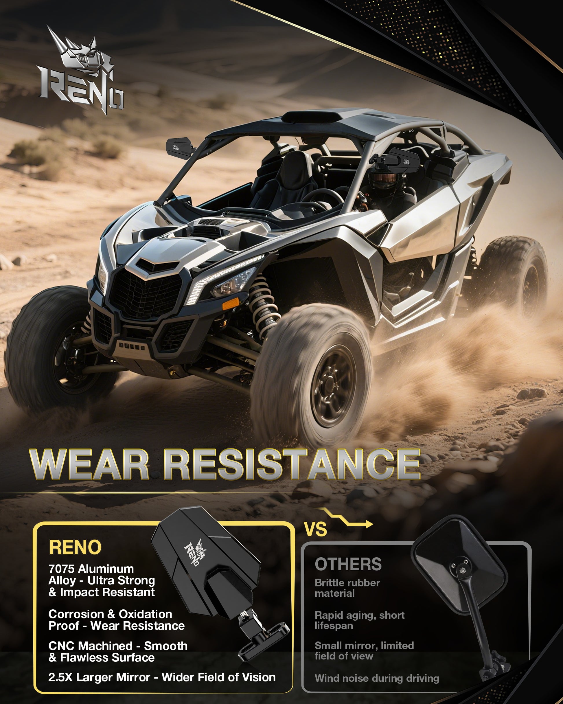 - 【Enhanced Visibility】Compared to standard mirrors, RENO UTV Mirrors features a large mirror of high-definition glass with a field of view that is more than 2.5 times that of standard mirrors, providing stability and clarity that allows you to safely navigate obstacles and narrow spaces.
